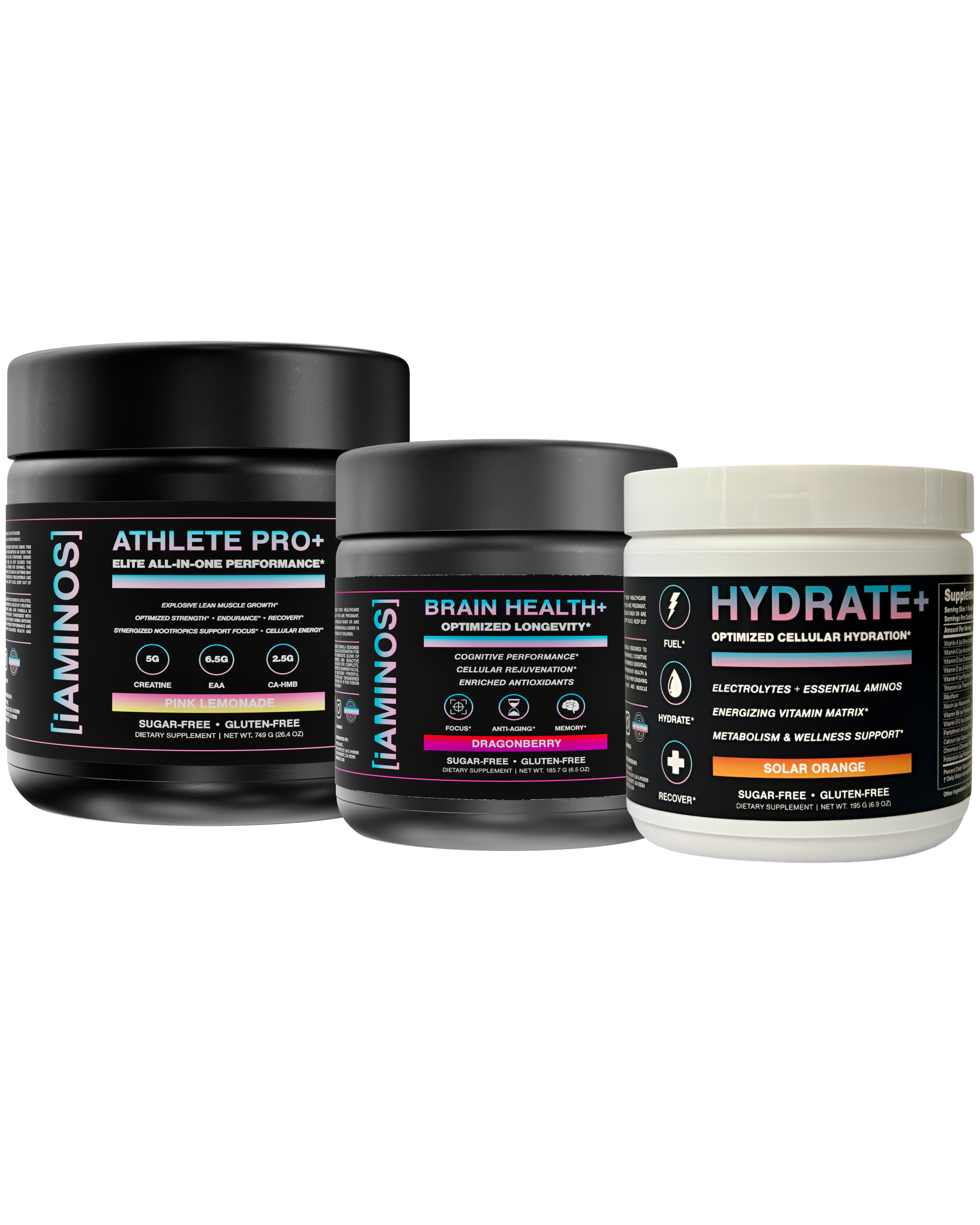 The Ultimate Performance Pack delivers comprehensive nutritional support for peak athletic performance. This expertly curated bundle combines Athlete Pro+ for enhanced strength and endurance, Brain Health+ to sharpen mental clarity and focus, and Hydrate+ for optimal fluid balance and electrolyte replenishment. Designed for serious athletes who demand excellence across all performance dimensions, this trio addresses muscle development, cognitive function, and hydration in one integrated system. Maximize your potential with science-backed formulations engineered to elevate every aspect of your training and competition.